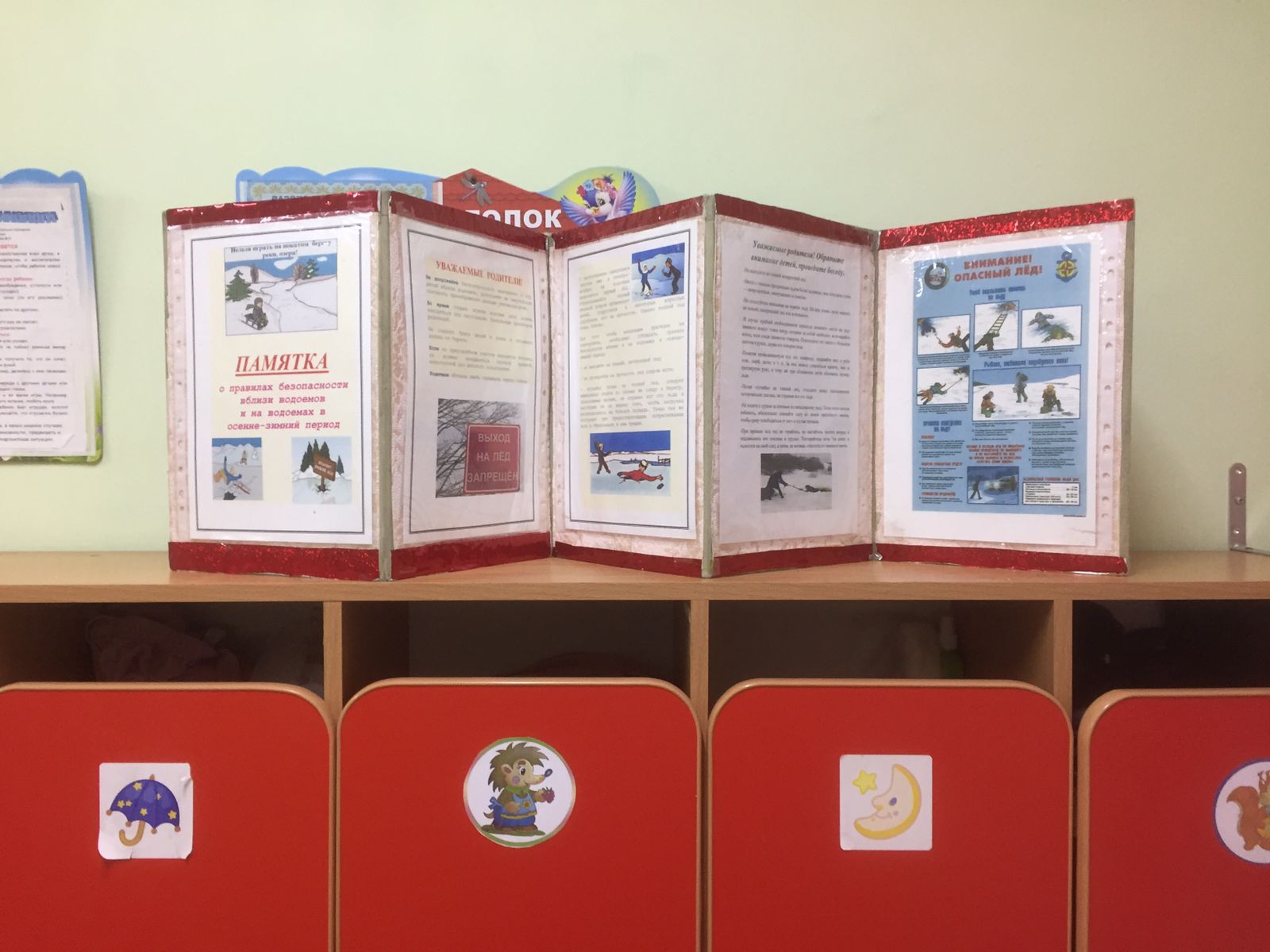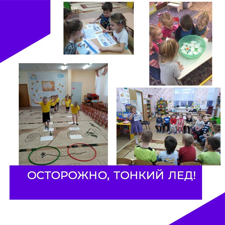 Для родителей (законных представителей) подготовили о мерах безопасности людей на льду консультаций на тему «Меры предосторожности и правила поведения людей на льду». Оформление (обновление) уголка безопасности в ДОУ: «Меры безопасности на водных объектах в зимний период», «Травмы на льду», «Оказание первой помощи при зимних травмах». Спортивное развлечение «Осторожно, хрупкий лед» проведено в группе «Лучики». Все возрастные группы приняли участие в данном мероприятии.
